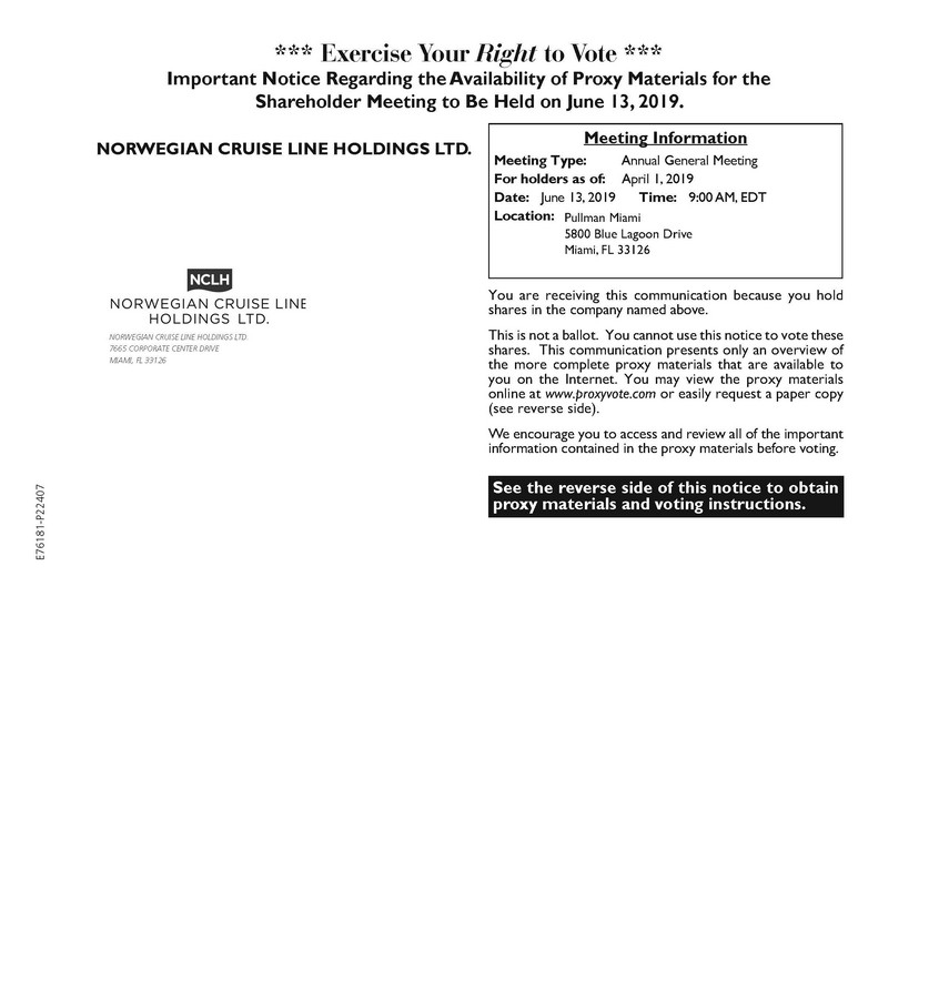 E76181-P22407 See the reverse side of this notice to obtain proxy materials and voting instructions. You are receiving this communication because you hold shares in the company named above. This is not a ballot. You cannot use this notice to vote these shares. This communication presents only an overview of the more complete proxy materials that are available to you on the Internet. You may view the proxy materials online at www.proxyvote.com or easily request a paper copy (see reverse side). We encourage you to access and review all of the important information contained in the proxy materials before voting. NORWEGIAN CRUISE LINE HOLDINGS LTD. *** Exercise Your Right to Vote *** Important Notice Regarding the Availability of Proxy Materials for the Shareholder Meeting to Be Held on June 13, 2019. NORWEGIAN CRUISE LINE HOLDINGS LTD. 7665 CORPORATE CENTER DRIVE MIAMI, FL 33126 Meeting Information Meeting Type: Annual General Meeting For holders as of: April 1, 2019 Date: June 13, 2019 Time: 9:00 AM, EDT Location: Pullman Miami 5800 Blue Lagoon Drive Miami, FL 33126