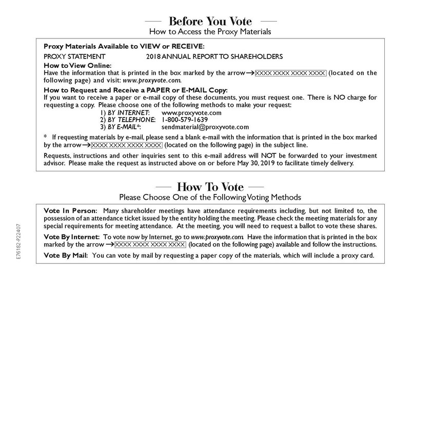 E76182-P22407 Vote In Person: Many shareholder meetings have attendance requirements including, but not limited to, the possession of an attendance ticket issued by the entity holding the meeting. Please check the meeting materials for any special requirements for meeting attendance. At the meeting, you will need to request a ballot to vote these shares. Vote By Internet: To vote now by Internet, go to www.proxyvote.com. Have the information that is printed in the box marked by the arrow (located on the following page) available and follow the instructions. Vote By Mail: You can vote by mail by requesting a paper copy of the materials, which will include a proxy card. How to View Online: Have the information that is printed in the box marked by the arrow (located on the following page) and visit: www.proxyvote.com. How to Request and Receive a PAPER or E-MAIL Copy: If you want to receive a paper or e-mail copy of these documents, you must request one. There is NO charge for requesting a copy. Please choose one of the following methods to make your request: 1) BY INTERNET: www.proxyvote.com 2) BY TELEPHONE: 1-800-579-1639 3) BY E-MAIL*: sendmaterial@proxyvote.com * If requesting materials by e-mail, please send a blank e-mail with the information that is printed in the box marked by the arrow (located on the following page) in the subject line. Proxy Materials Available to VIEW or RECEIVE: × XXXX XXXX XXXX XXXX × XXXX XXXX XXXX XXXX × XXXX XXXX XXXX XXXX Before You Vote How to Access the Proxy Materials How To Vote Please Choose One of the Following Voting Methods Requests, instructions and other inquiries sent to this e-mail address will NOT be forwarded to your investment advisor. Please make the request as instructed above on or before May 30, 2019 to facilitate timely delivery. PROXY STATEMENT 2018 ANNUAL REPORT TO SHAREHOLDERS
