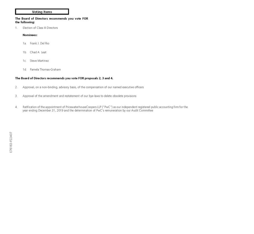 Voting Items E76183-P22407 2. Approval, on a non-binding, advisory basis, of the compensation of our named executive officers 3. Approval of the amendment and restatement of our bye-laws to delete obsolete provisions 1a. Frank J. Del Rio 1b. Chad A. Leat 1c. Steve Martinez 1. Election of Class III Directors The Board of Directors recommends you vote FOR the following: The Board of Directors recommends you vote FOR proposals 2, 3 and 4. Nominees: 1d. Pamela Thomas-Graham 4. Ratification of the appointment of PricewaterhouseCoopers LLP ("PwC") as our independent registered public accounting firm for the year ending December 31, 2019 and the determination of PwC's remuneration by our Audit Committee
