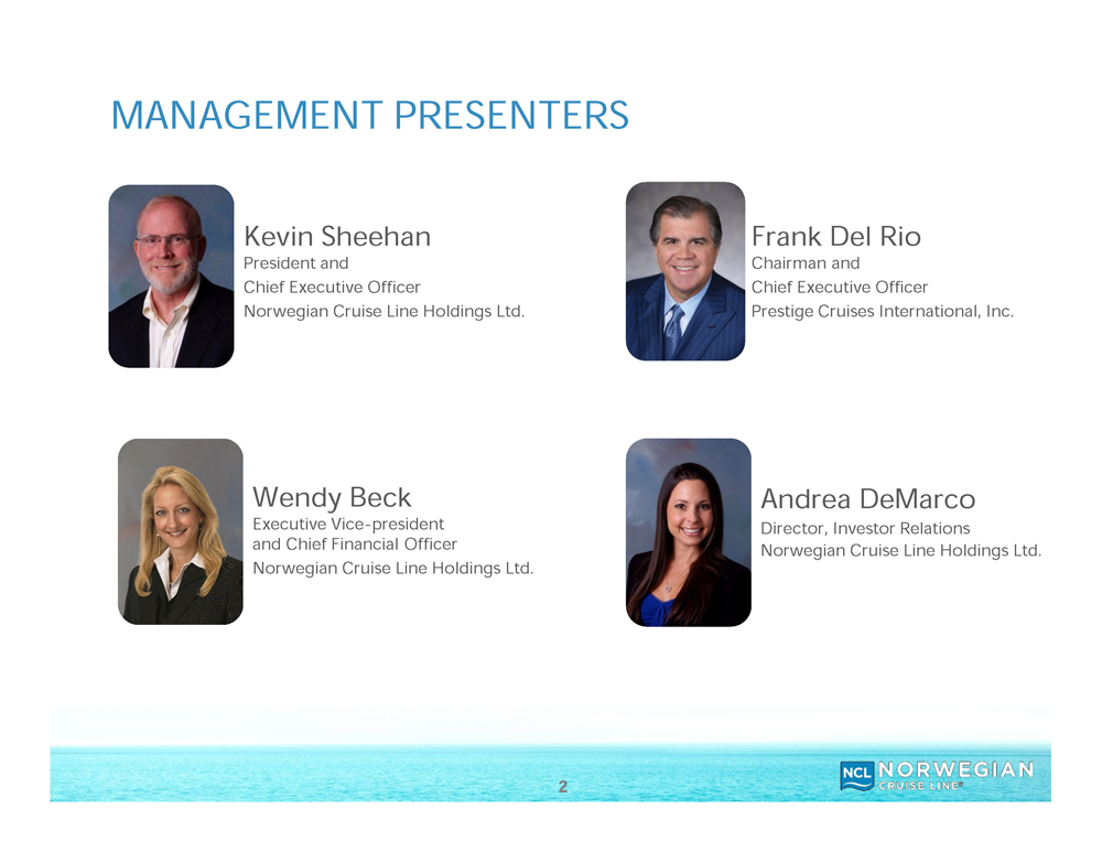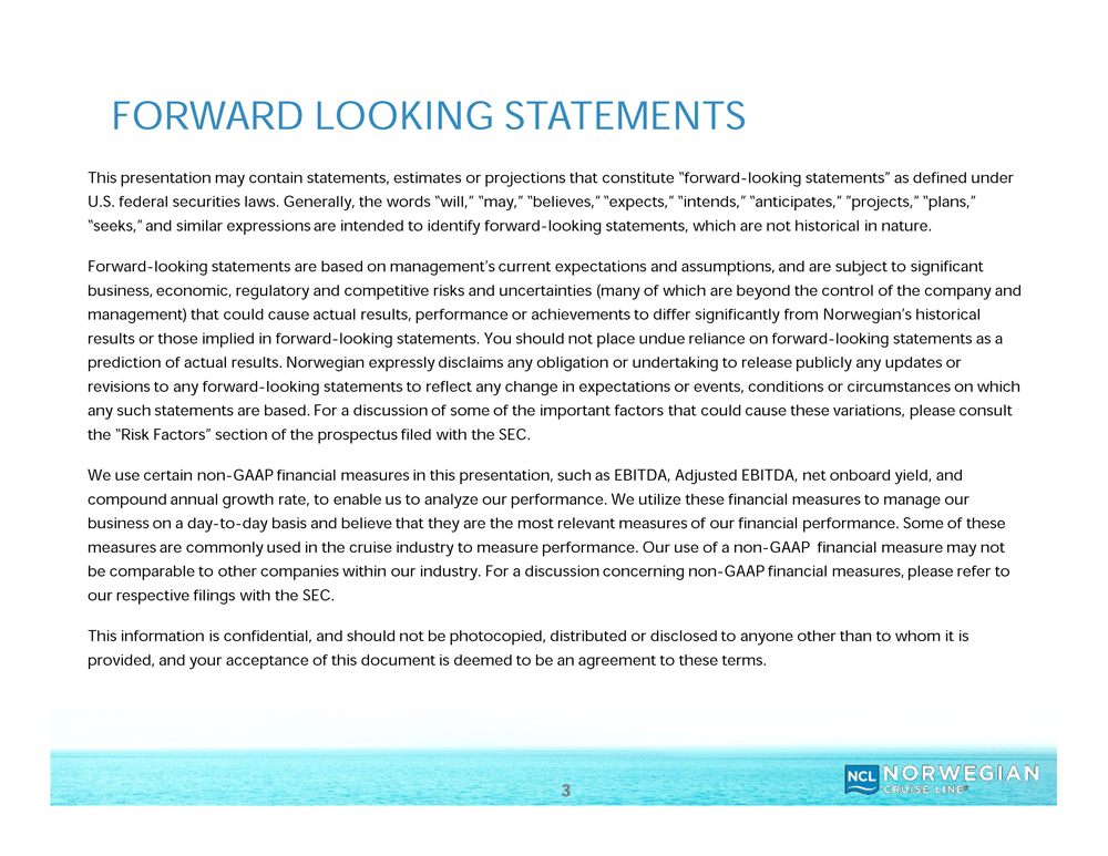 We use certain non-GAAP financial measures in this presentation, such as EBITDA, Adjusted EBITDA, net onboard yield, and compound annual growth rate, to enable us to analyze our performance. We utilize these financial measures to manage our business on a day-to-day basis and believe that they are the most relevant measures of our financial performance. Some of these measures are commonly used in the cruise industry to measure performance. Our use of a non-GAAP financial measure may not be comparable to other companies within our industry. For a discussion concerning non-GAAP financial measures, please refer to our respective filings with the SEC.