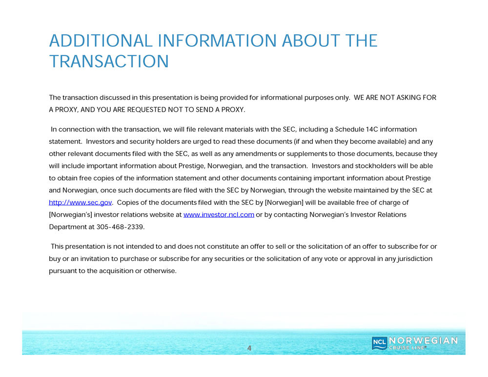 In connection with the transaction, we will file relevant materials with the SEC, including a Schedule 14C information statement. Investors and security holders are urged to read these documents (if and when they become available) and any other relevant documents filed with the SEC, as well as any amendments or supplements to those documents, because they will include important information about Prestige, Norwegian, and the transaction. Investors and stockholders will be able to obtain free copies of the information statement and other documents containing important information about Prestige and Norwegian, once such documents are filed with the SEC by Norwegian, through the website maintained by the SEC at http://www.sec.gov. Copies of the documents filed with the SEC by [Norwegian] will be available free of charge of