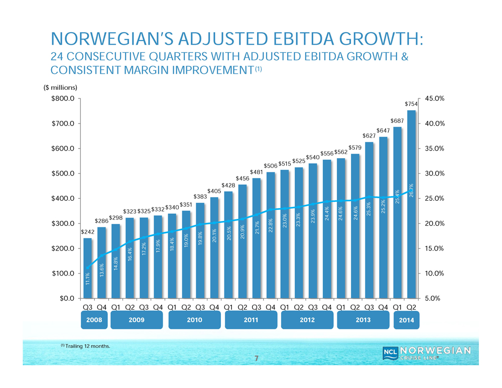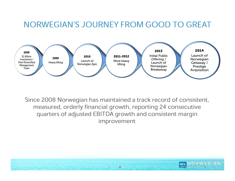 Since 2008 Norwegian has maintained a track record of consistent, measured, orderly financial growth, reporting 24 consecutive quarters of adjusted EBITDA growth and consistent margin improvement