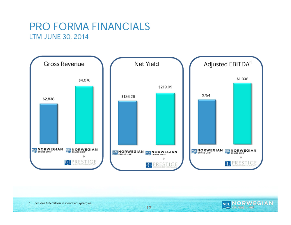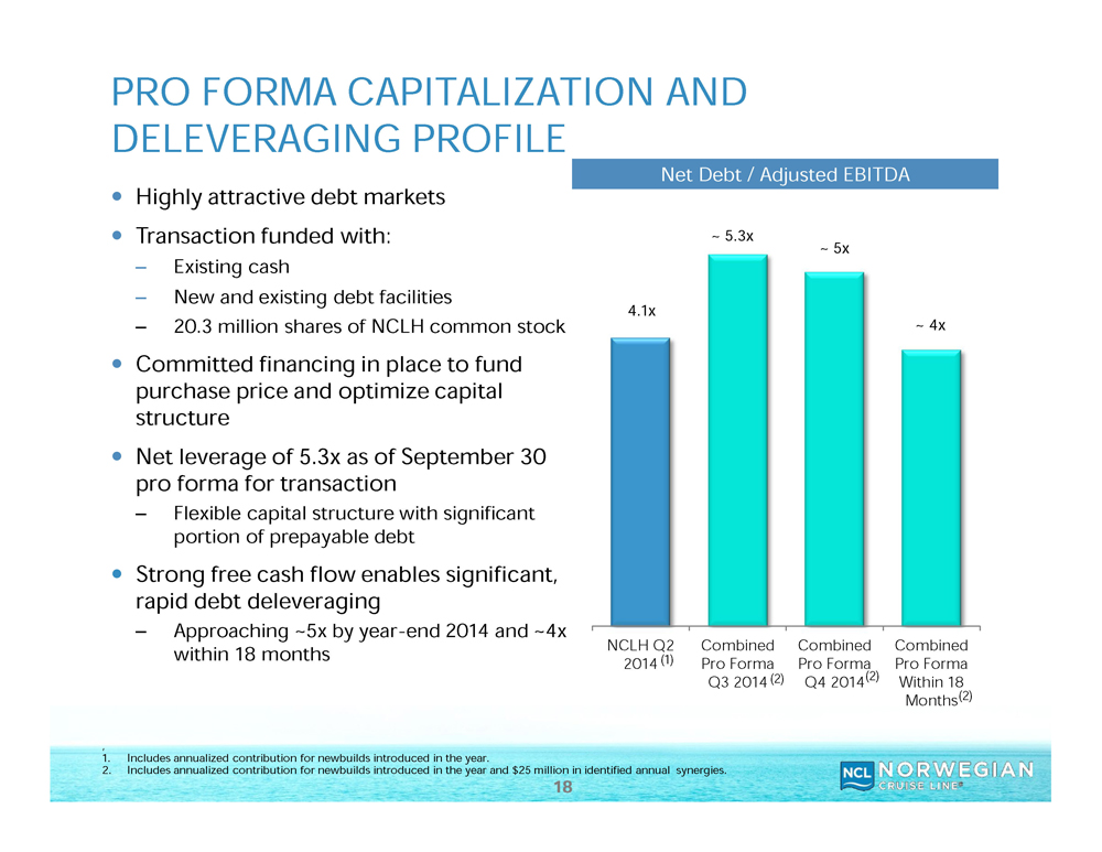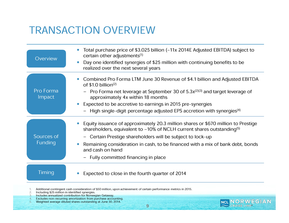 Equity issuance of approximately 20.3 million shares or $670 million to Prestige shareholders, equivalent to ~10% of NCLH current shares outstanding(5) Sources of Certain Prestige shareholders will be subject to lock-up Funding Remaining consideration in cash, to be financed with a mix of bank debt, bonds and cash on hand