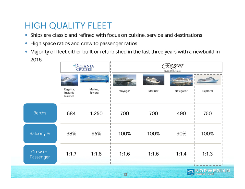 Ships are classic and refined with focus on cuisine, service and destinations High space ratios and crew to passenger ratios Majority of fleet either built or refurbished in the last three years with a newbuild in 2016