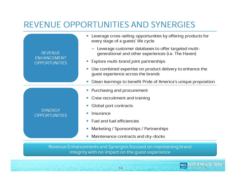 Glean learnings to benefit Pride of America’s unique proposition Purchasing and procurement Crew recruitment and training