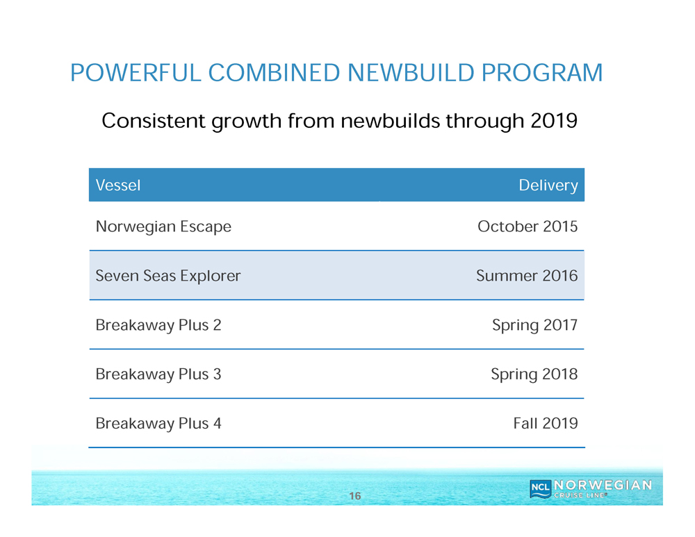 Vessel Delivery Norwegian Escape October 2015 Seven Seas Explorer Summer 2016 Breakaway Plus 2 Spring 2017 Breakaway Plus 3 Spring 2018 Breakaway Plus 4 Fall 2019